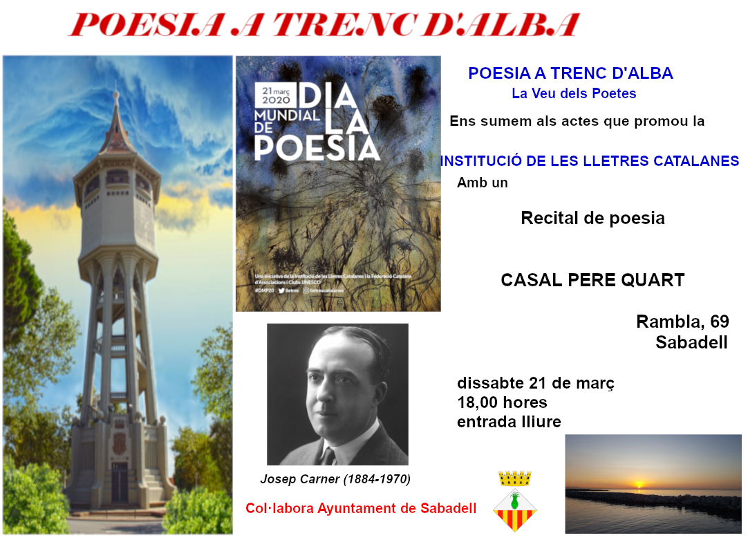 El pasado 23 de febrero, un día y 79 años después de su muerte en Colliure, el colectivo Poesia a Trenc d'Alba, rindió homenaje al poeta Antonio Machado en local social de la Asociación de Vecinos de Covadonga, Sabadell. Es la tercera vez en medio año de existencia, tras Mollet y Can Rull, que nuestro grupo de poetas y rapsodas escenifica la vida y obra del genial poeta sevillano.